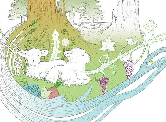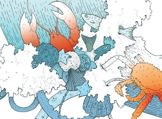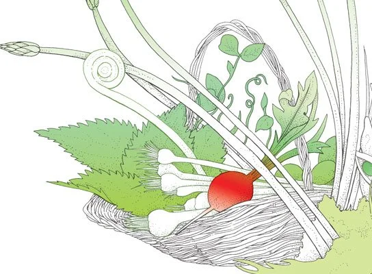 Tous les produits des 15 menus différents cuisinés par les 45 chefs sélectionnés ont été représentés dans les illustrations: des aliments printaniers locaux typiques des Etats-Unis: agneau, crabe, homard, coquilles Saint-Jacques, asperges, petits pois etc..